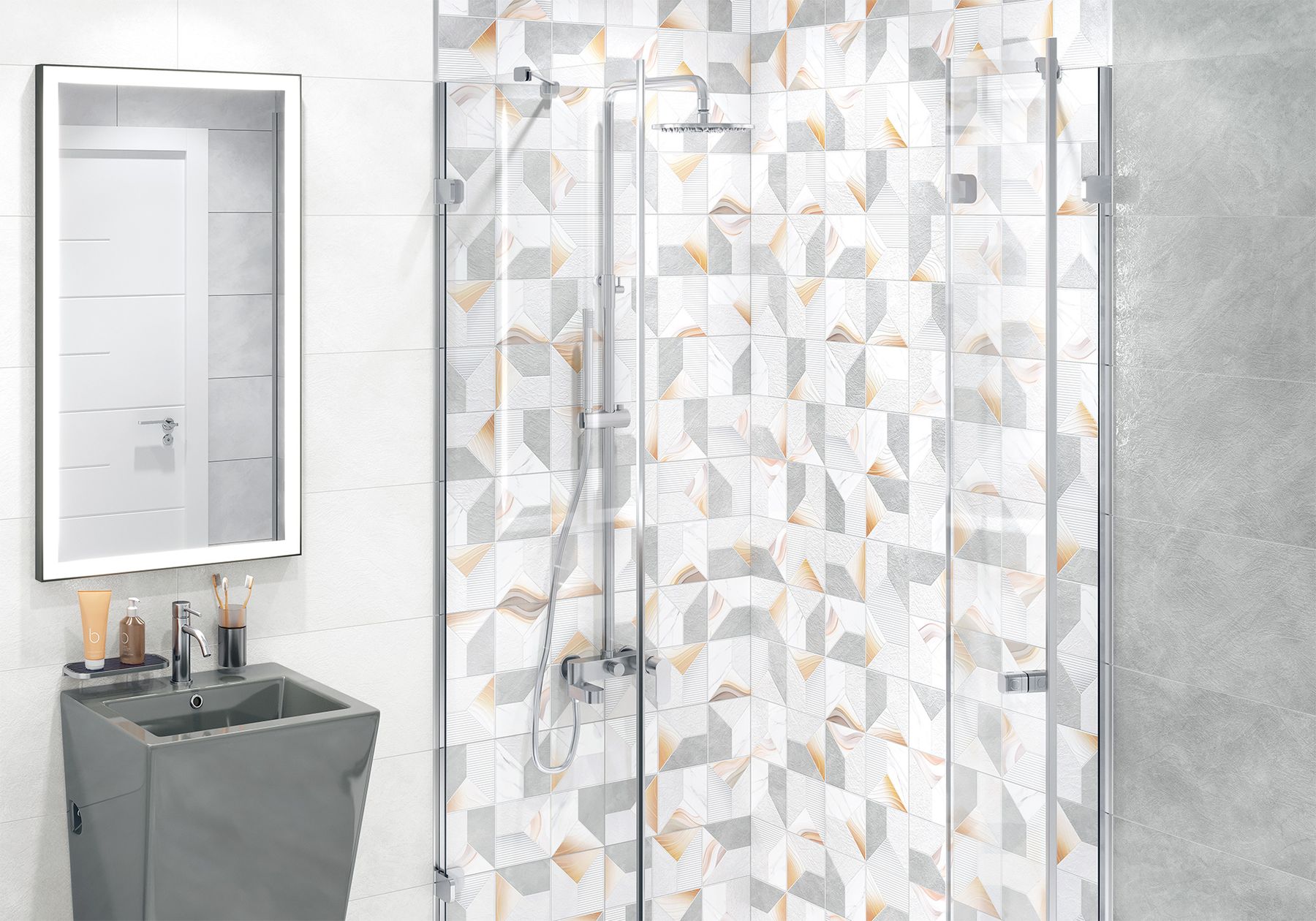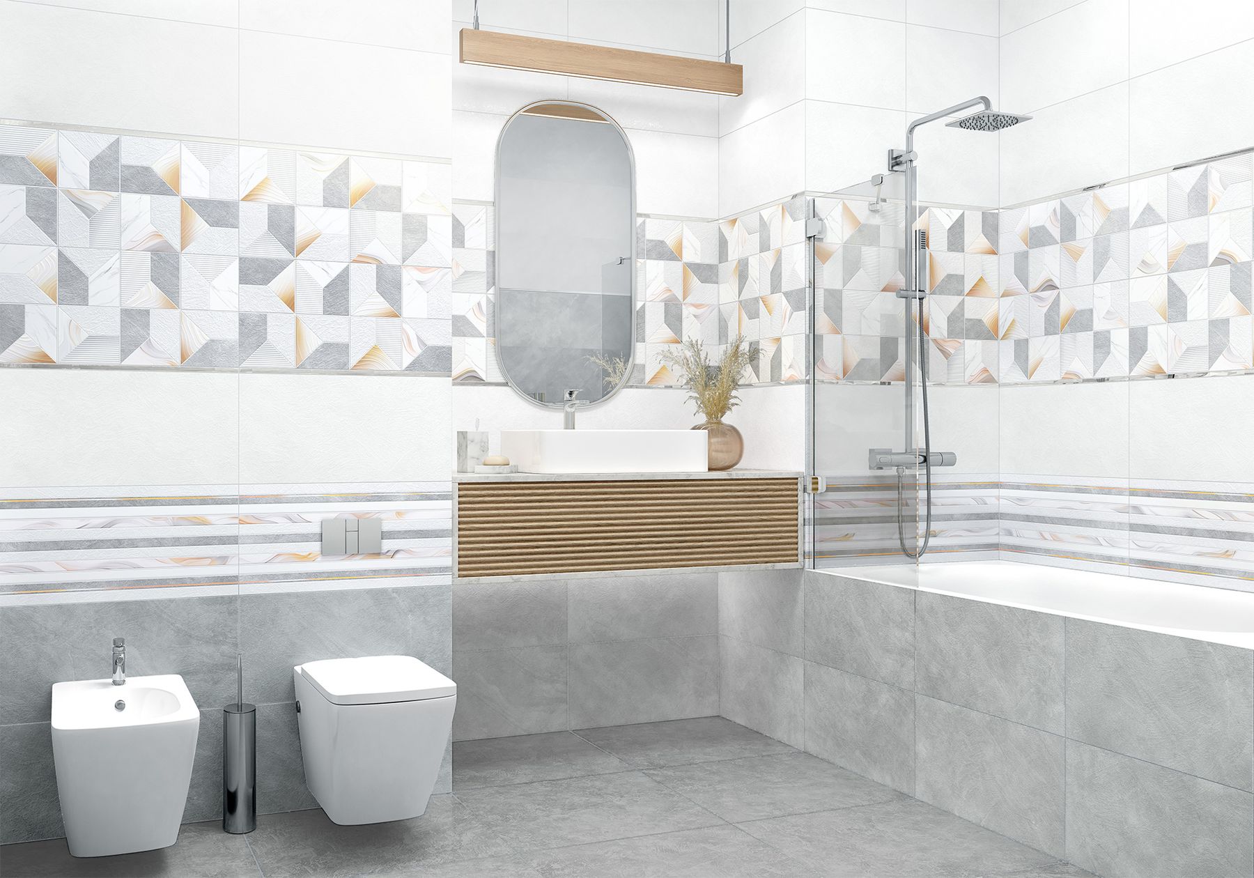 Коллекция Blues выполнена в холодной гамме серых оттенков с текстурой декоративной штукатурки. Глянцевая поверхность плиток дополнена спецэффектом матовых чернил, которые создают на поверхности сатиновую текстуру и объём. За счет этого хаотичные мазки штукатурки получаются с интересным сочетанием глянцевой и матовой поверхности. В коллекции два акцентных элемента для того, чтобы разнообразить пространство и выделить функциональные зоны в интерьере. Первый — это декоративный массив в виде разноцветных полос, объединяющих все текстуры. Второй элемент в виде рельефных квадратов с оригинальной геометричной нарезкой и яркими треугольными вставками с волнообразным градиентным принтом. Коллекция произведена в формате 300×600 мм, дополнена керамическим бордюром 13×600 мм в платиновом цвете, а также лаппатированным керамогранитом 600×600 мм.