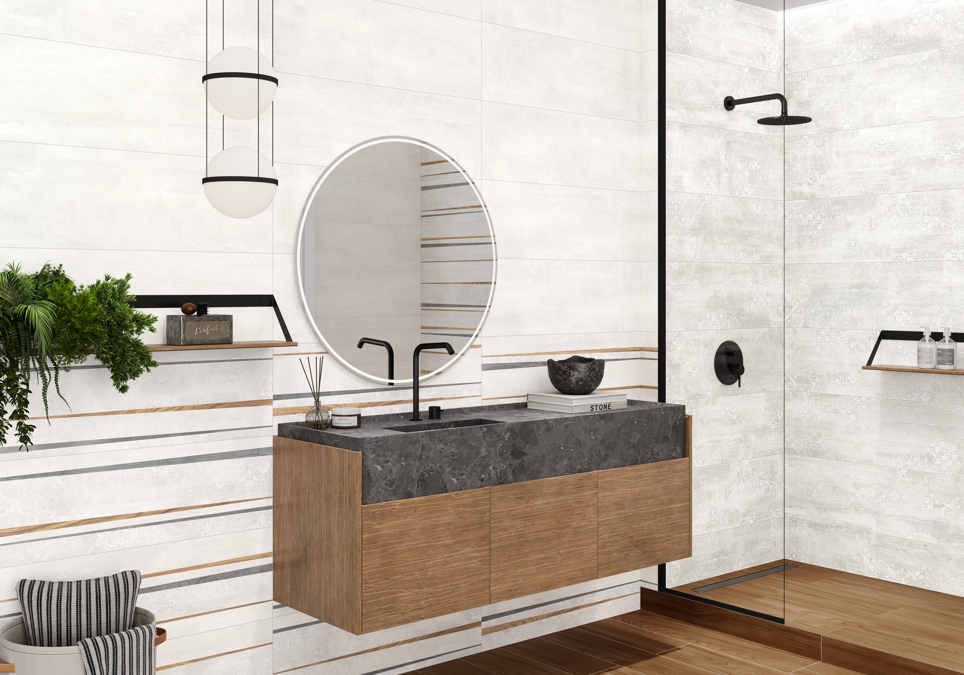 Коллекция настенной плитки Dakar произведена в формате 300x900 мм, с рельефной матовой поверхностью. Базовые плитки представлены в виде объёмной цементной штукатурки в серой гамме темного и светлого оттенка. Акцентом коллекции являются два декоративных массива: один в виде штукатурки с ажурным принтом, второй в виде разно размерных фрагментов разных текстур серии. Дополняет коллекцию деревянный керамогранит 200x900 мм натурального оттенка и керамогранит в формате 600х600 мм с текстурой бетона. Все элементы прекрасно сочетаются друг с другом и будут гармонично смотреться в интерьере, позволяя расставлять акценты и выделять зоны. Плитки имеют ректифицированный край, что позволяет осуществить укладку с минимальным швом.