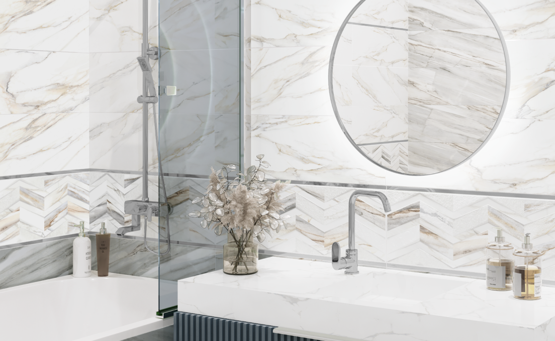 Коллекция Delta — это сочетание тёплого белого мрамора Calacatta Gold и камня Elegant Gray.