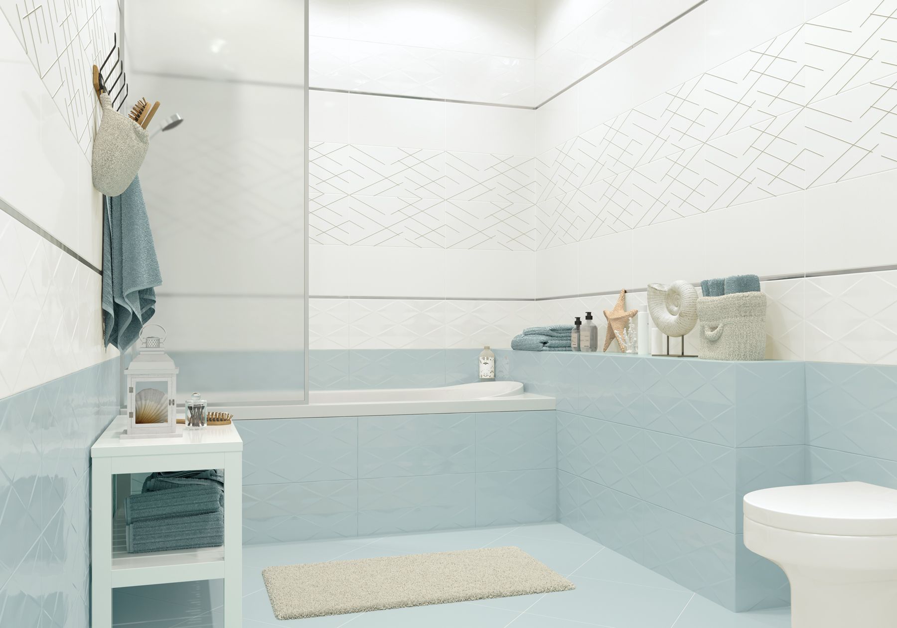 Глянцевая поверхность коллекции Fly с легкой рельефной текстурой и тонким серебристым орнаментом прекрасно украсят интерьер в современном стиле. Коллекция представлена в двух воздушных оттенках — белом и голубом. Серебряный бордюр-стик станет элегантным дополнением интерьера.