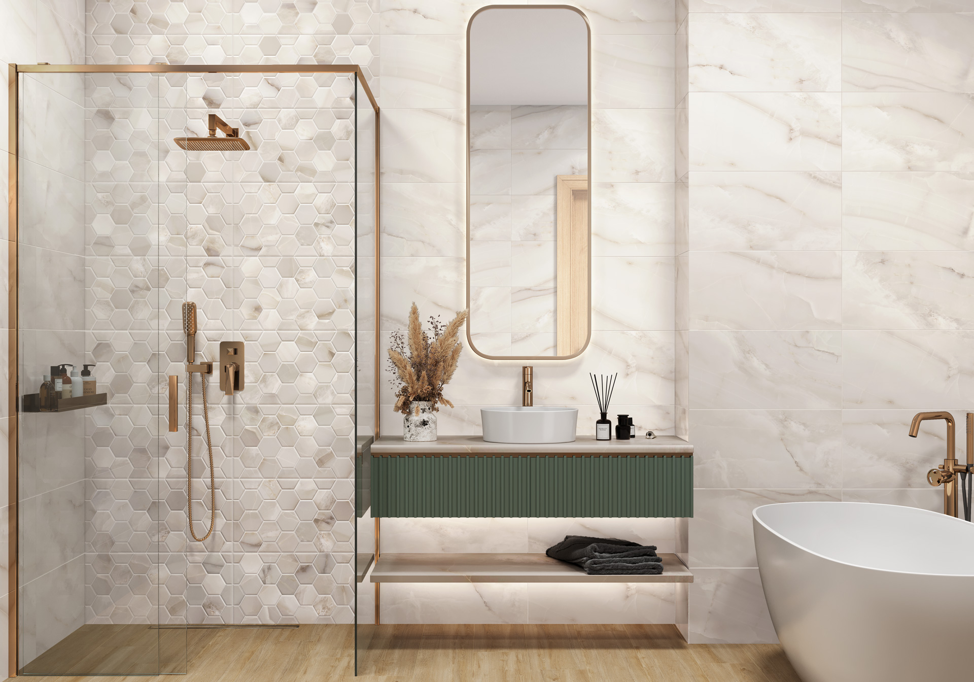 Современный стиль в керамике разнообразен и интересен, как правило он представлен в виде различных орнаментов и геометричных принтов. В коллекции Milenial акцентный элемент представлен в виде стыкующихся рельефных шестиугольников. Благодаря необычной форме такая плитка современно и оригинально смотрится не только в ванных комнатах, санузлах, но и может использоваться в качестве кухонного фартука или акцентной стены. Базовая плитка с текстурой оникса гармонично перекликается с объемным декоративным массивом. Дополняет коллекцию керамический бордюр 13x600 мм в платиновом цвете и керамодоска в формате 200x900 мм.