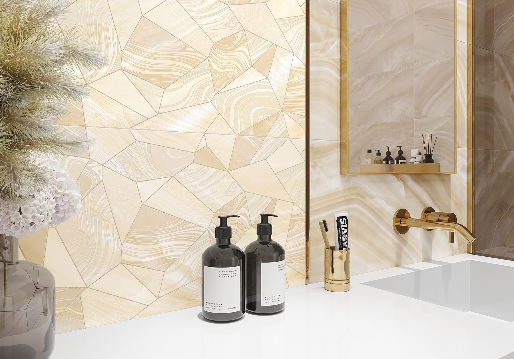 Глянцевая коллекция Venice в формате 300×600 мм — это золотистый оникс в керамическом исполнении. Тёплые солнечные оттенки будут поднимать настроение и создавать уют. Оригинальный декор на полудрагоценном камне станет украшением интерьера. Особенность этого декора в том, что он стыкуется, создавая на стене единую геометричную сетку. В декоре использованы нежные и оригинальные материалы: зеркальный люстр, перламутровый металлик, мерцающий глиттер и интерферентная паста, которая меняет свой цвет в зависимости от угла падения световых лучей. Керамический бордюр 13×600 мм в цвете золота и лаппатированный керамогранит 600×600 мм являются завершающим дополнением коллекции.